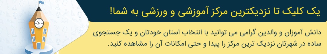 آیا می دانستید که آموزش ایران به شما کمک می کند تا با 2 کلیک نزدیک ترین مرکز آموزشی و ورزشی به محل مورد نظرتان را پیدا کنید. شما می توانید بعد از یافتن مرکز مورد نظر و ورود به صفحه ی اختصاصی شان با امکانات و ویژگی هایشان آشنا شوید، درضمن می توانید راه های ارتباطی با آنها را در صفحه ی مورد نظر پیدا کنید.یک ویژگی دیگر که می تواند برایتان جالب باشد این مورد است که می توایند مکان جغرافیایی مرکز مورد نظرتان را روی نقشه پیدا کنید.